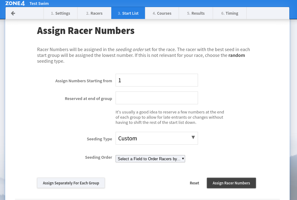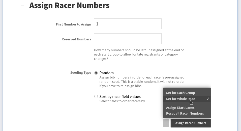 Also coming from skiing, we’ve been using “seeding” as the terminology for the order that racer numbers are assigned in. This terminology is foreign to many new racer directors, and with this change we’re moving to the more understandable “Order By” label when choosing how racer numbers are assigned.