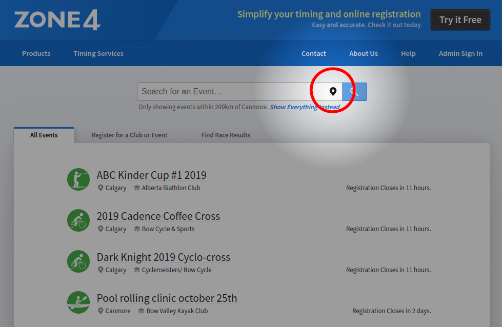 To make things easier, we’ve enabled location filtering on Zone4.ca: just click the little place marker in the search bar to only display events within 200km of your location.