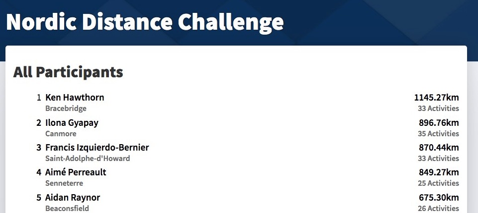 Using our newest virtual event platform, Nordiq Canada are hosting a most km skied challenge. Participants from all over the country are entering their kms. Here is the current top 5, pretty impressive with over 1000 km skied for number 1 ! The challenge is open until February 28th.