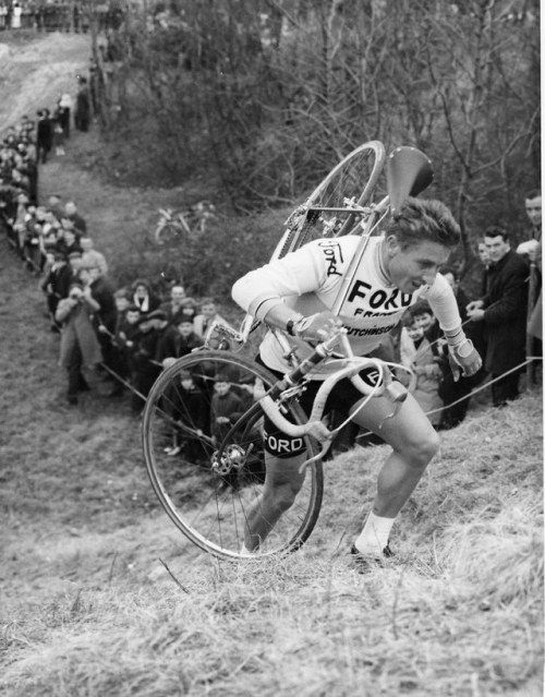 Throughout the 1920s and 1930s, cyclocross gained a loyal fanbase. Spectators would gather on cold weekends to watch riders grind through mud and vault over barriers. In fact, France saw huge crowds attending cyclocross events between the world wars. The first international cyclocross race, ambitiously titled Le Critérium International de Cross-Country Cyclo-Pédestre, took place in Paris in 1924. This effectively served as an unofficial world championship, proving that the appeal of “mud races” extended beyond any one country’s borders. By this time, races had become more structured, often run on marked courses (frequently looping circuits) rather than pure point-to-point dashes, but they retained the core challenge of mixed terrain and required dismounts. Elite road cyclists like Eugène Christophe and others dabbled in cyclocross, helping to refine techniques (Christophe was among the pioneers of carrying the bike on the shoulder to clear obstacles smoothly ). The sport’s popularity was on the rise, even if its governance was still catching up.
